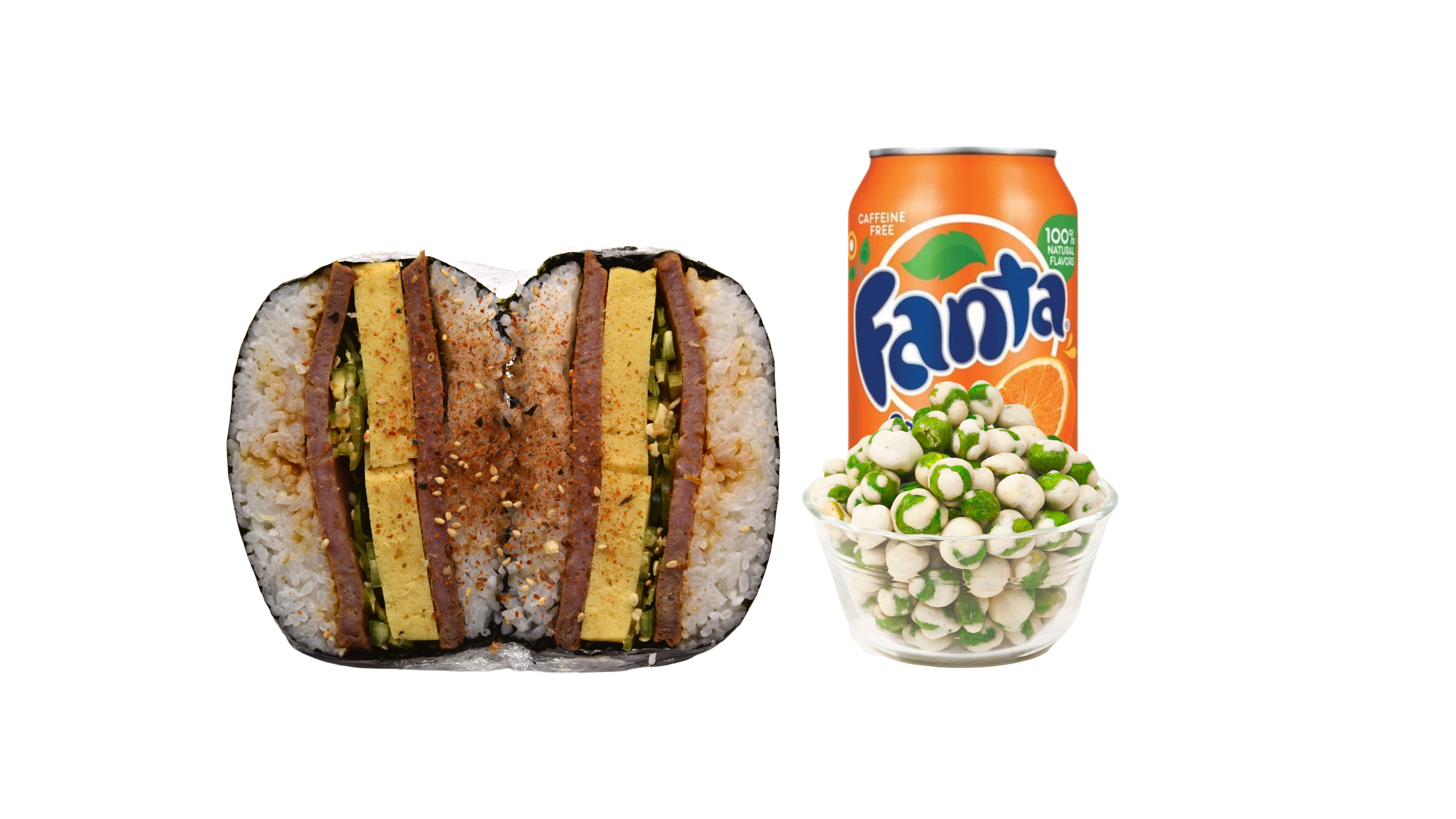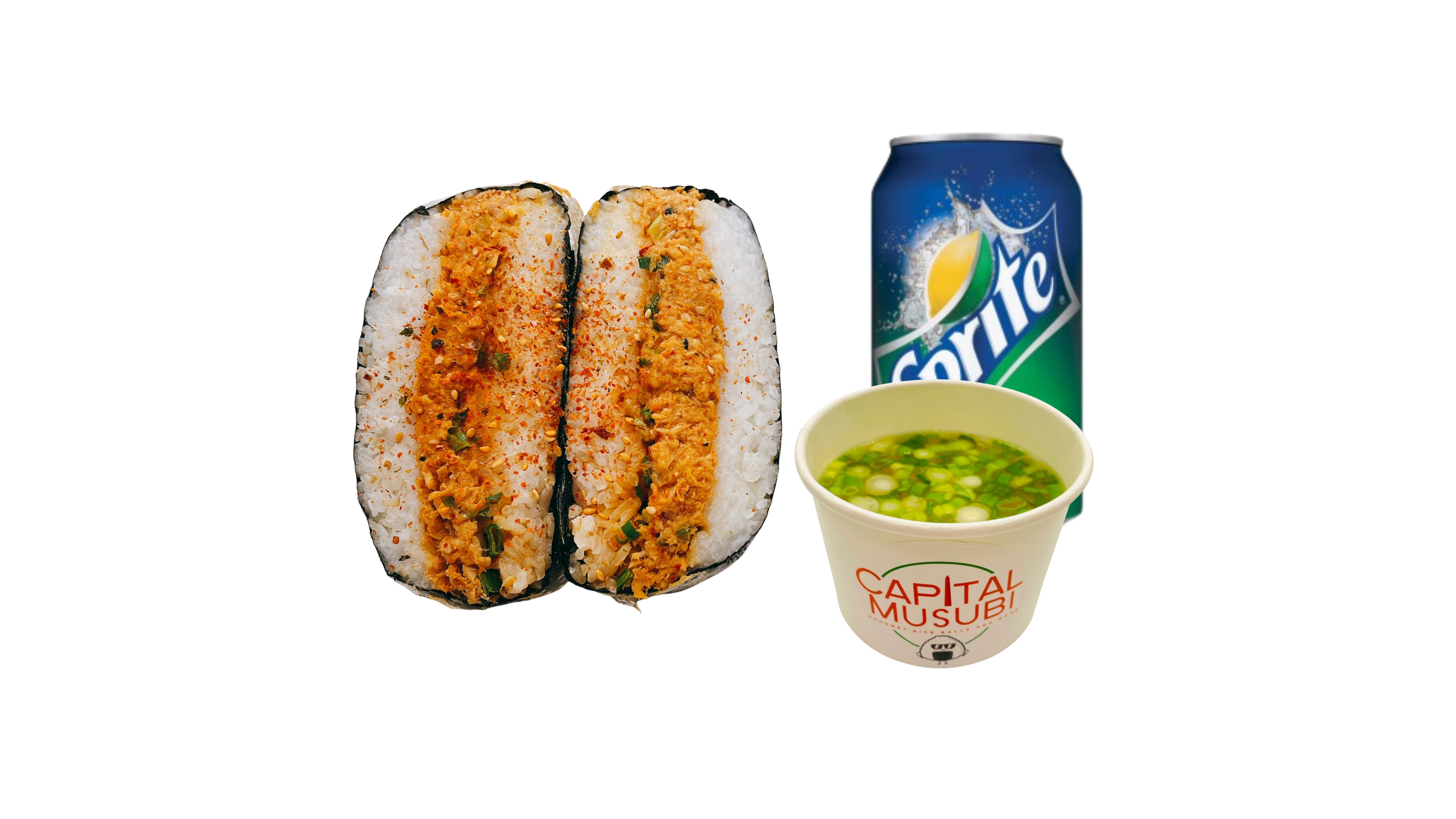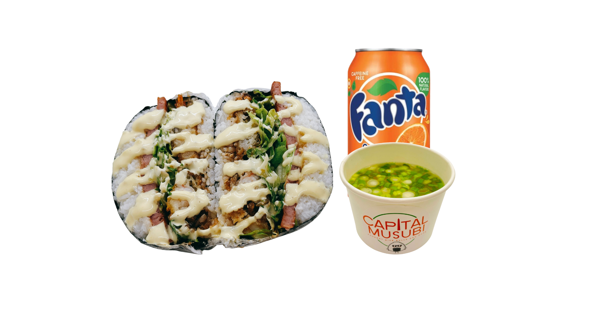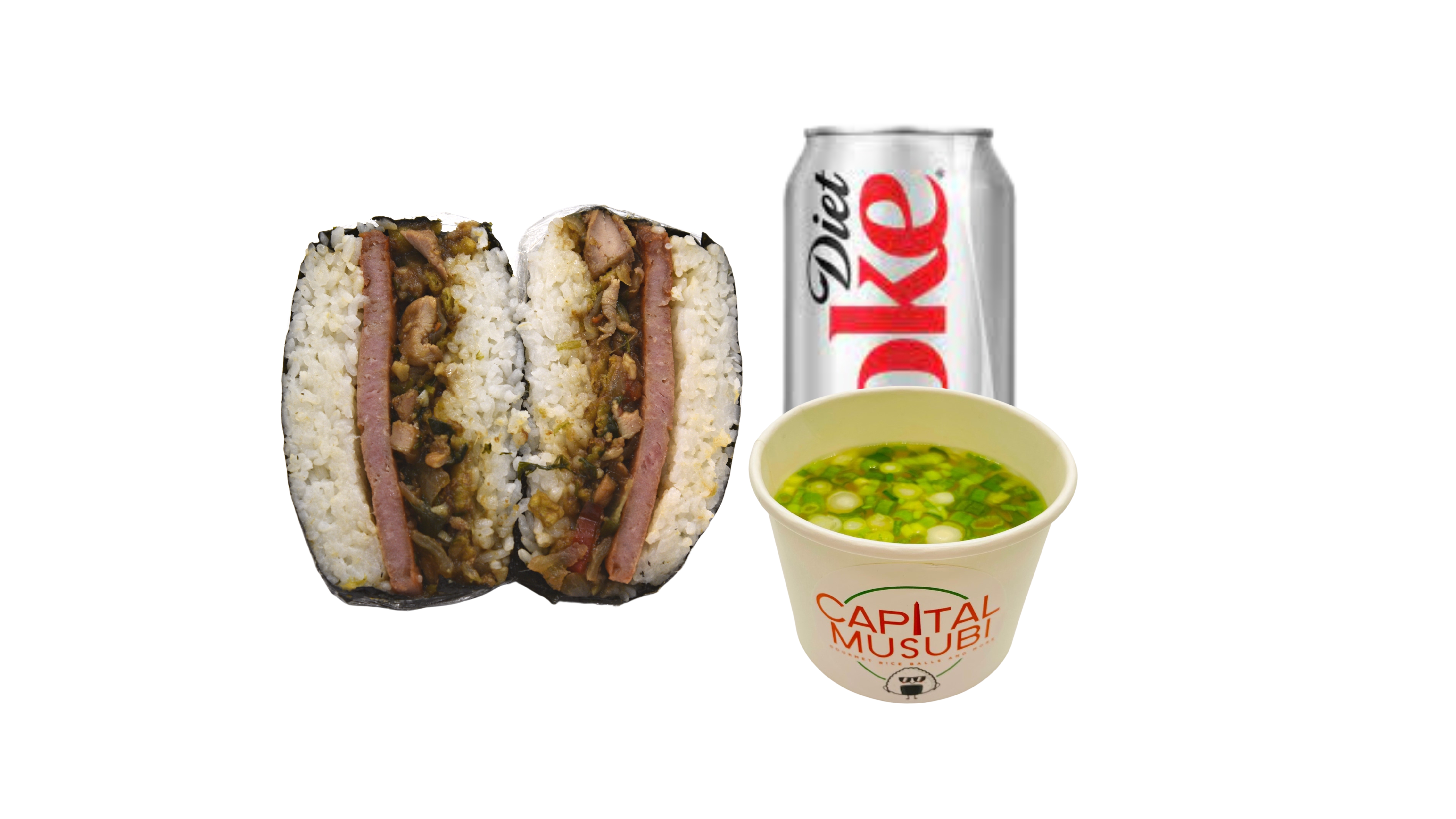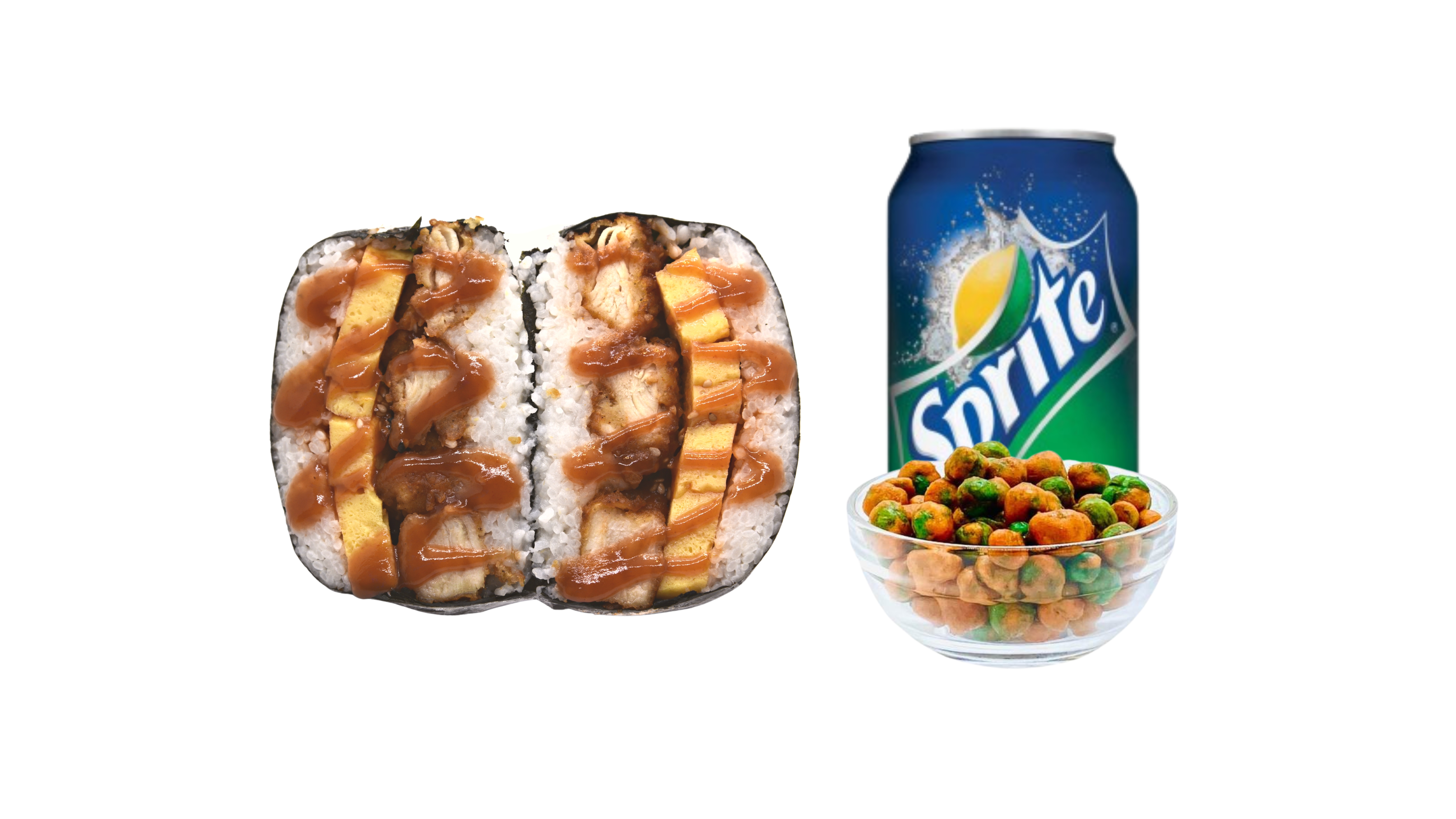Supersize Musubi ( 2 spams, musubi sauce, toasted sesame seeds, furikake) wrapped in roasted seaweed sheet. Combo it with your choice of One side and One drink.