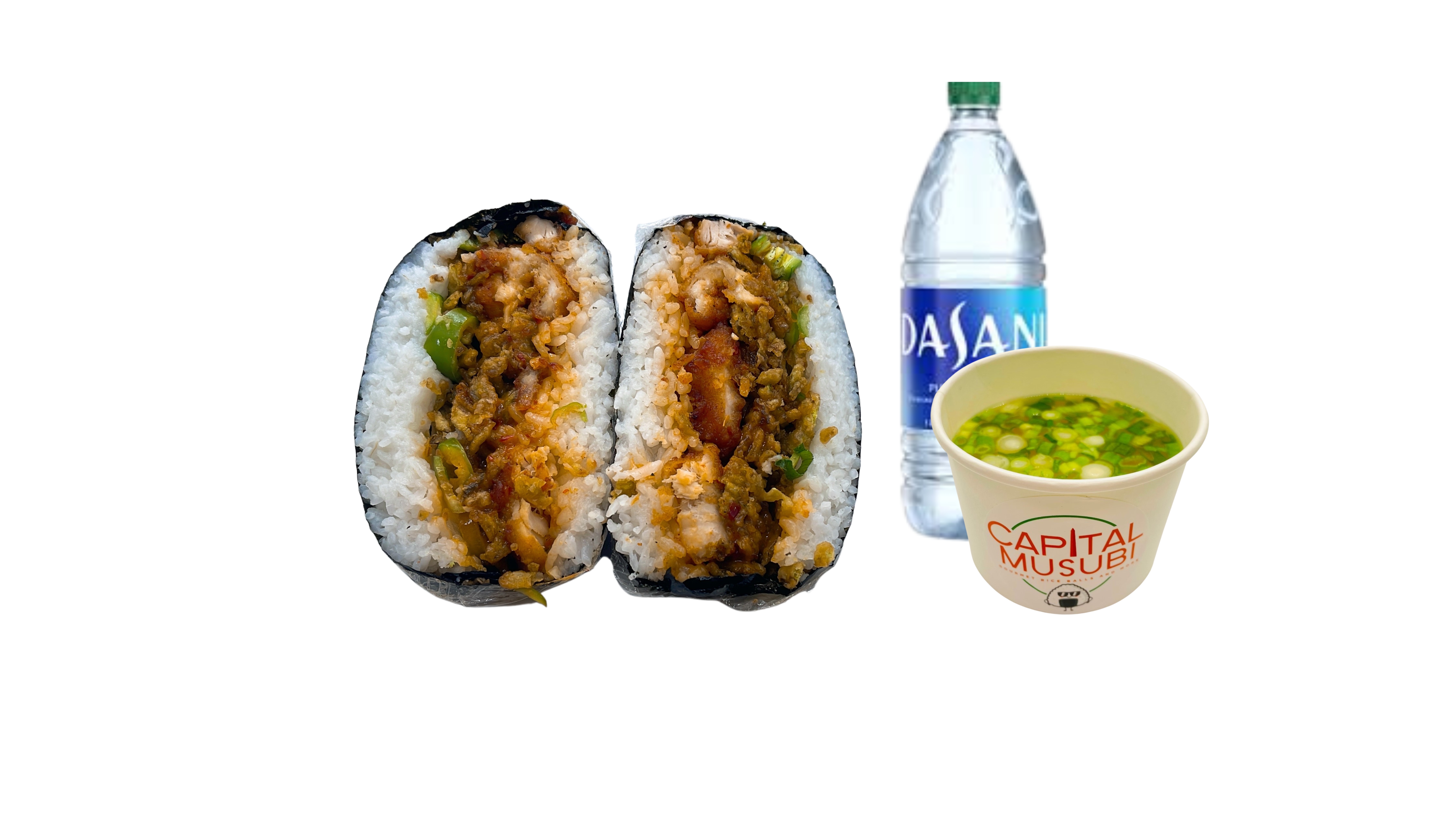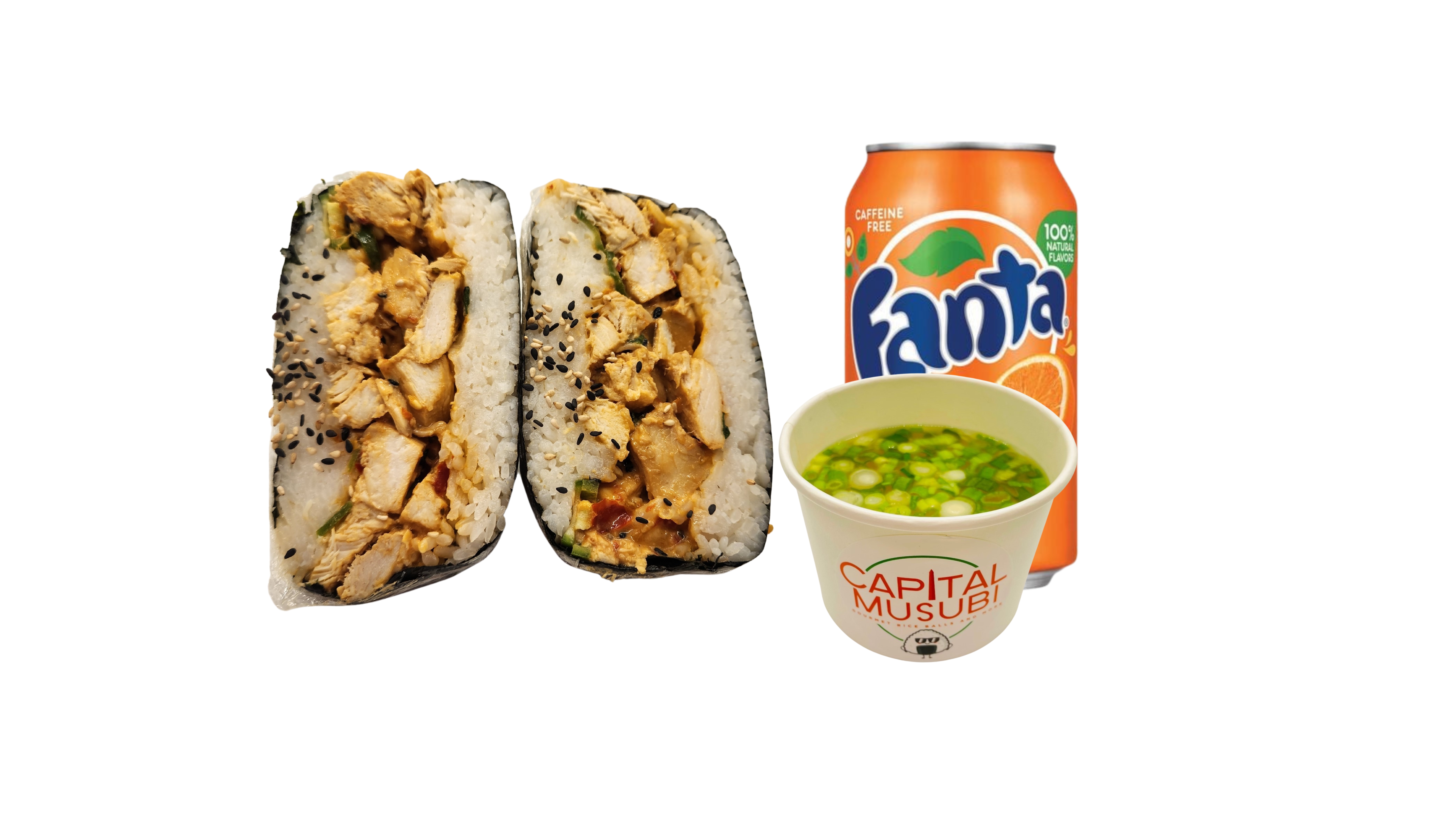 Supersize Musubi (cooked chicken, sriracha mayo, green onion, serrano peppers, toasted sesame seeds)wrapped in roasted seaweed sheet. Combo it with your choice of One side and One drink.