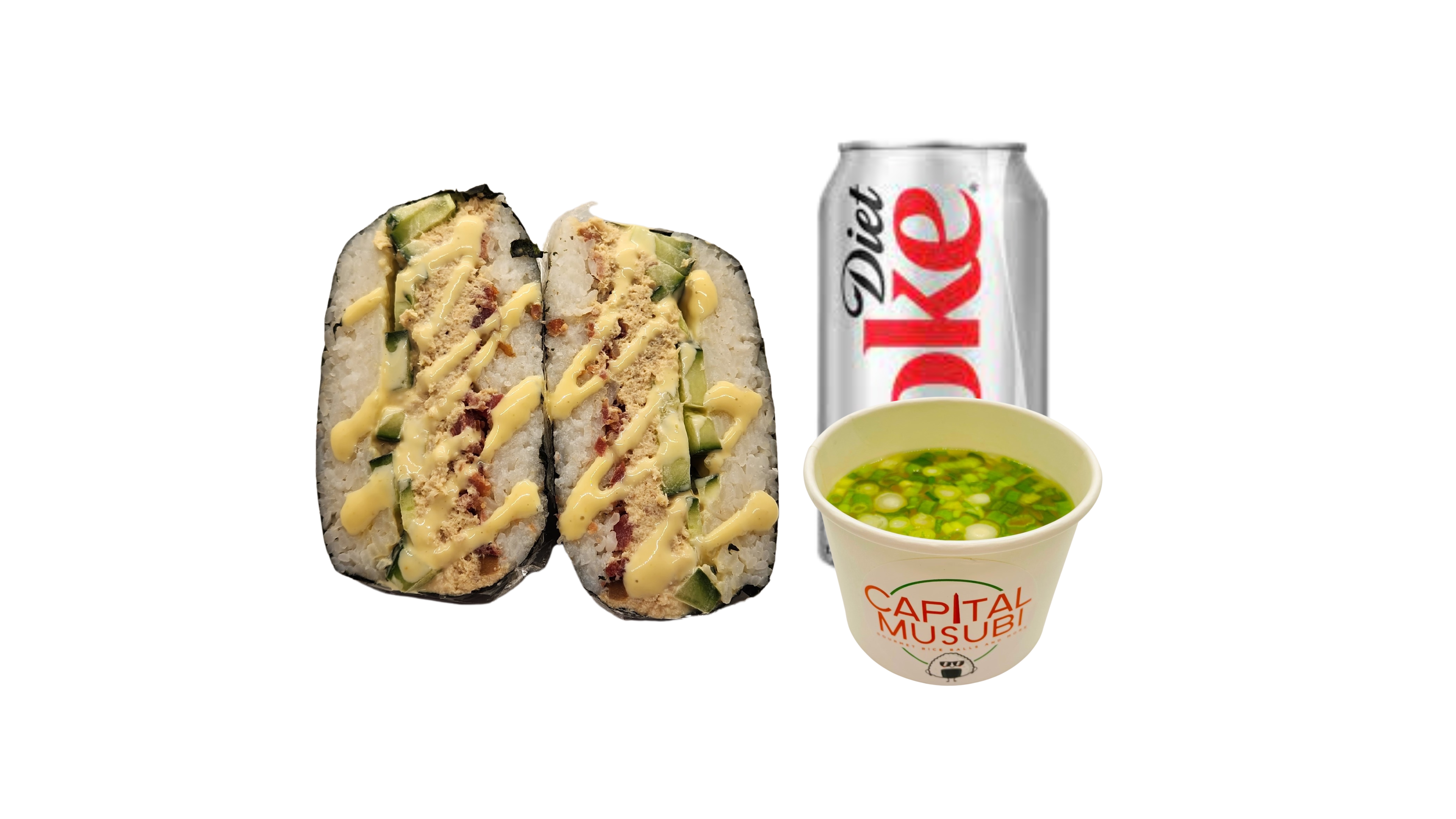 Supersize Musubi (Cooked Salmon, Bacon Crumbles, CM Mayo, cucumbers, toasted sesame seeds, furikake) wrapped in roasted seaweed sheet. Combo it with your choice of One side and One drink.