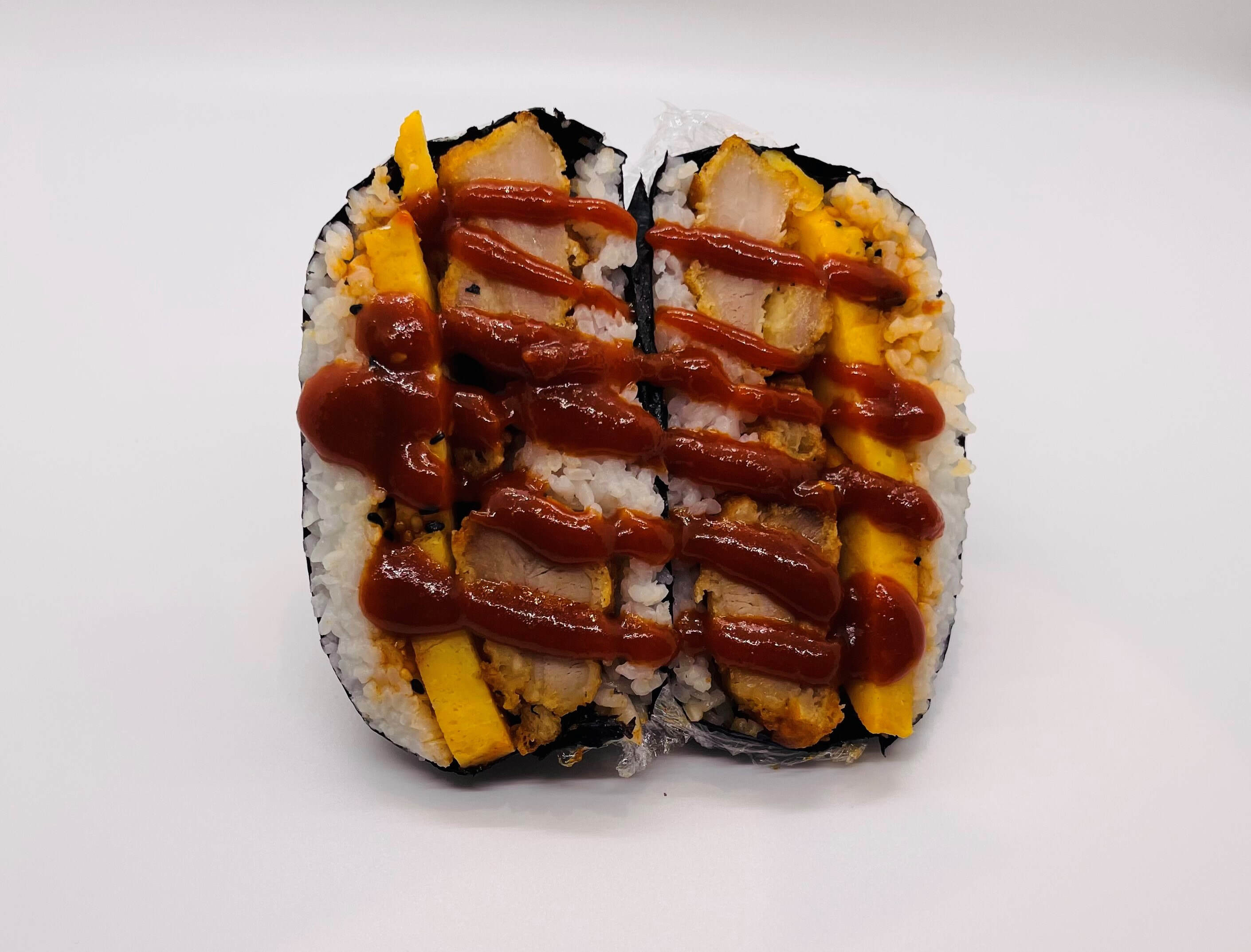 Supersize Musubi (sushi rice, chicken karaage, eggs, toasted sesame seeds, drizzle in Hawaiian ketchup). Wrapped in roasted seaweed sheet.