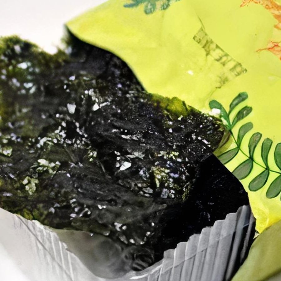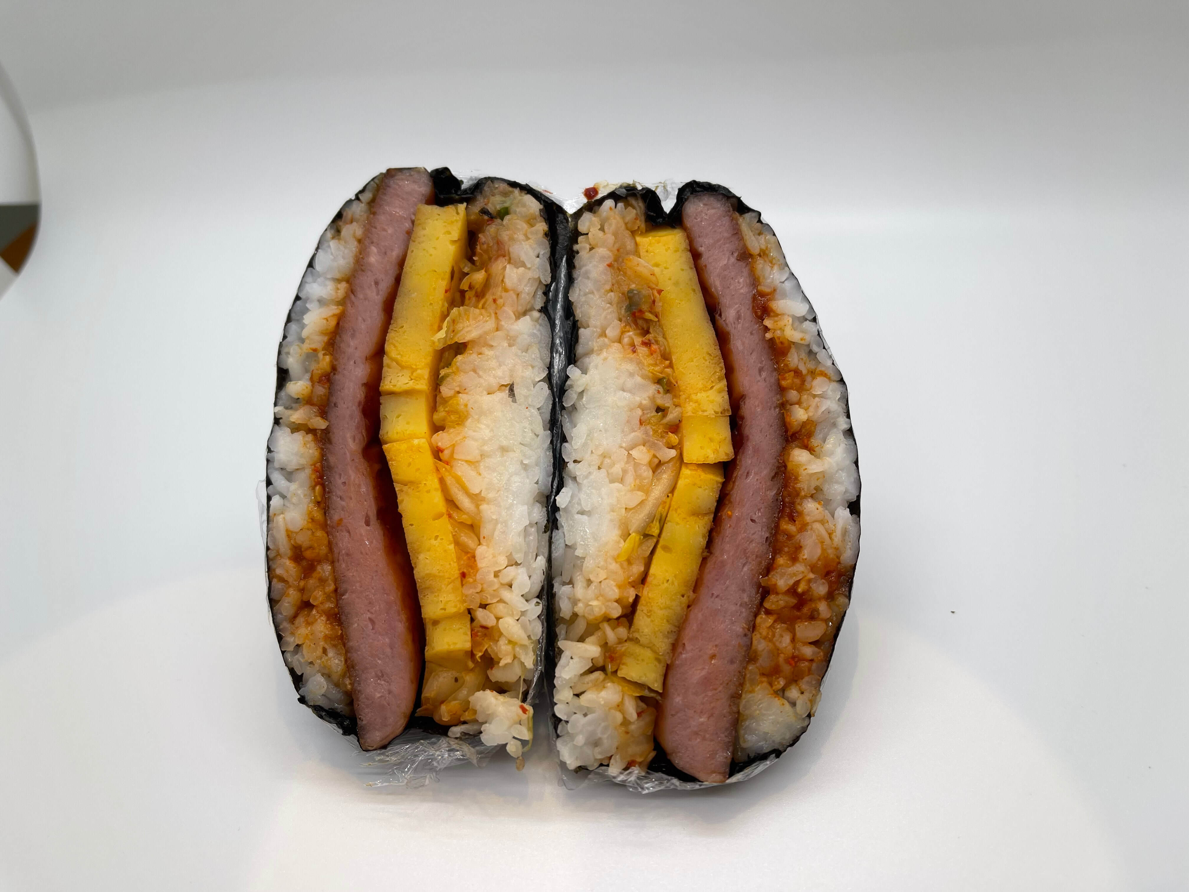 Supersize Musubi (Spam, Kimchi, eggs, Gojuchang sauce, toasted sesame seeds) wrapped in roasted seaweed sheet.