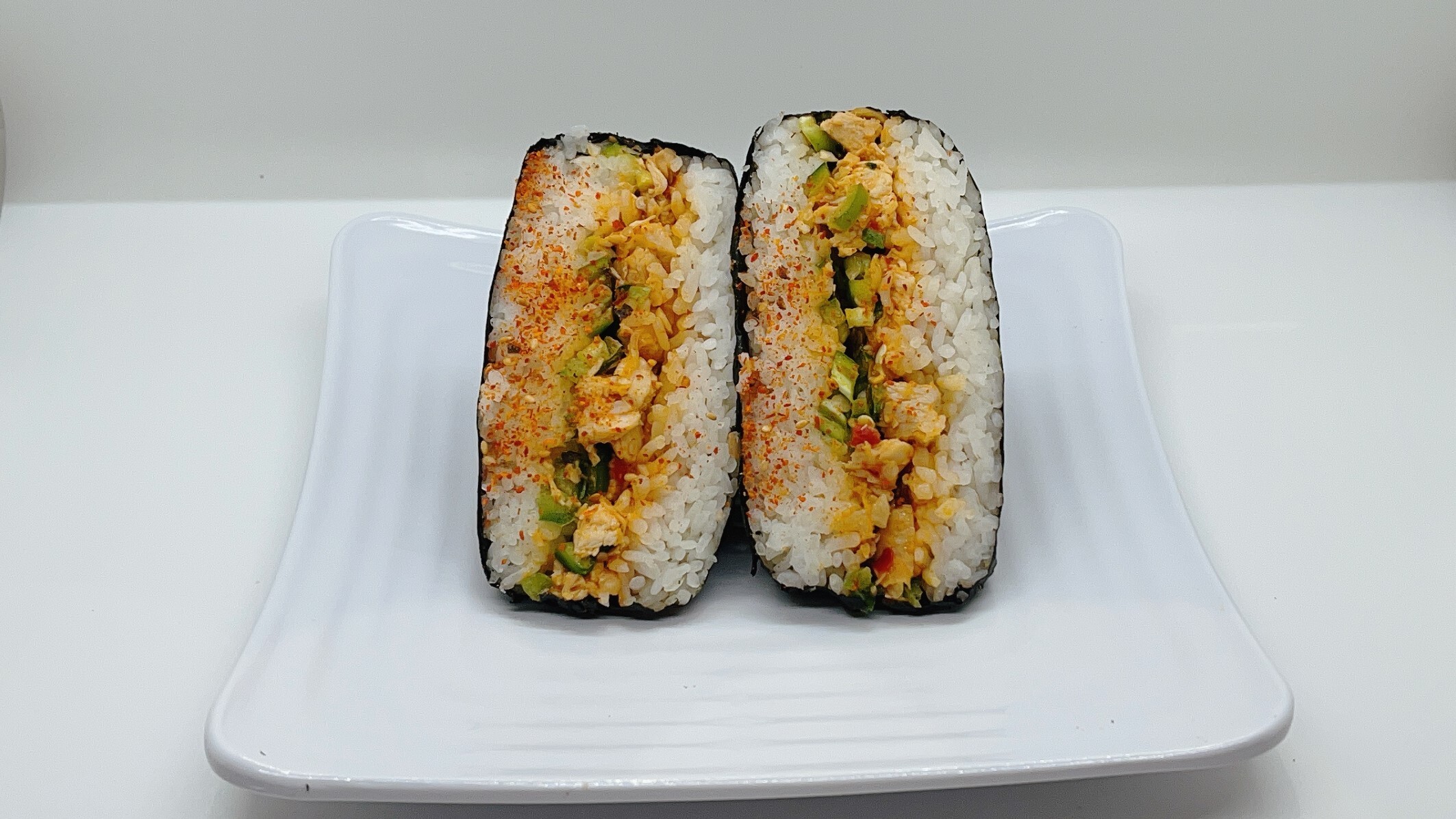 Sushi rice with spicy chicken and serrano pepper filling, wrapped in toasted seaweed sheet.