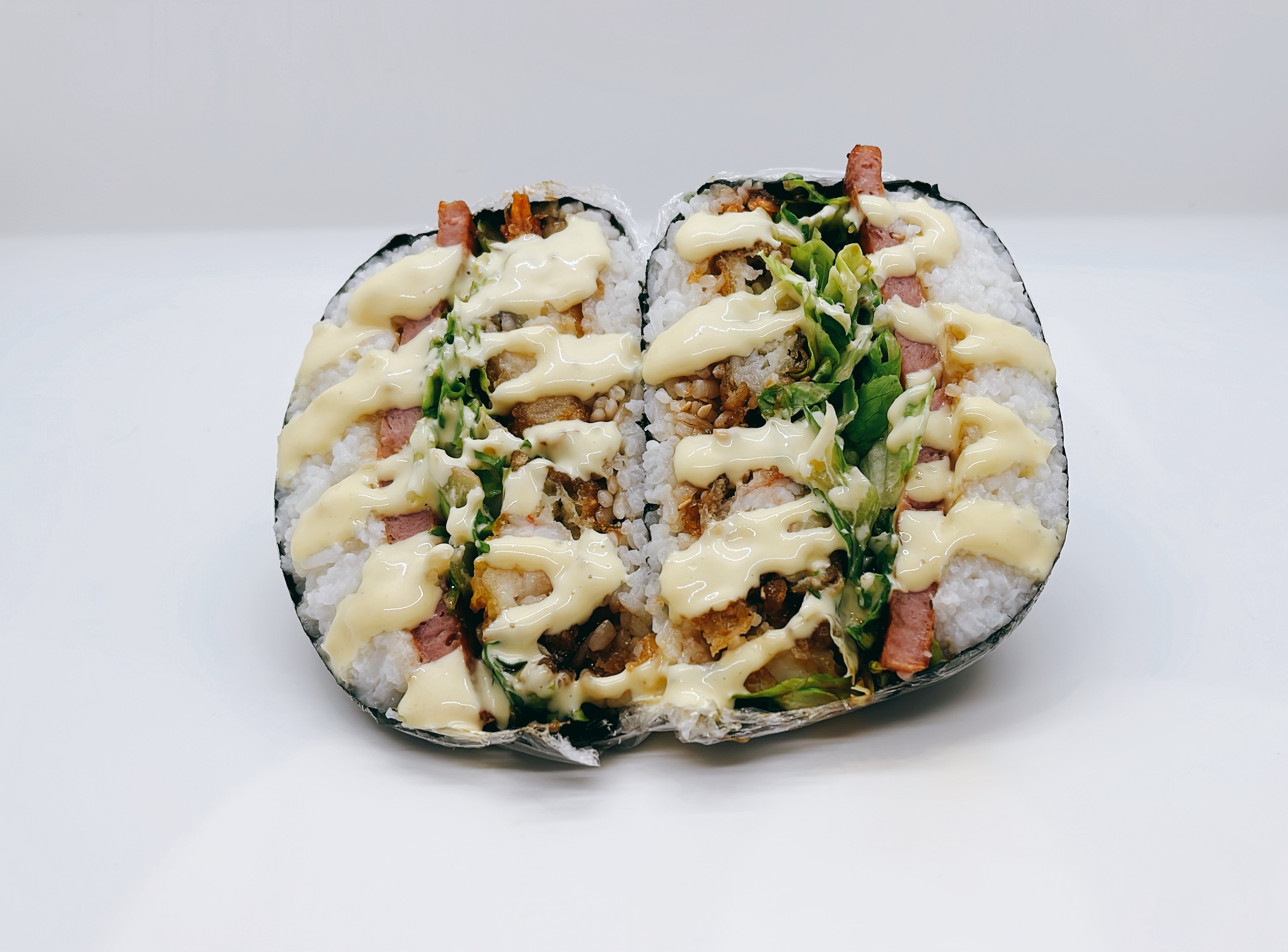 Supersize Musubi (Sushi Rice, shrimp tempuras(2), spam, lettuce, toasted sesame seeds, sweet shoyu sauce, drizzle with CM mayo). All wrapped in roasted seaweed sheet.