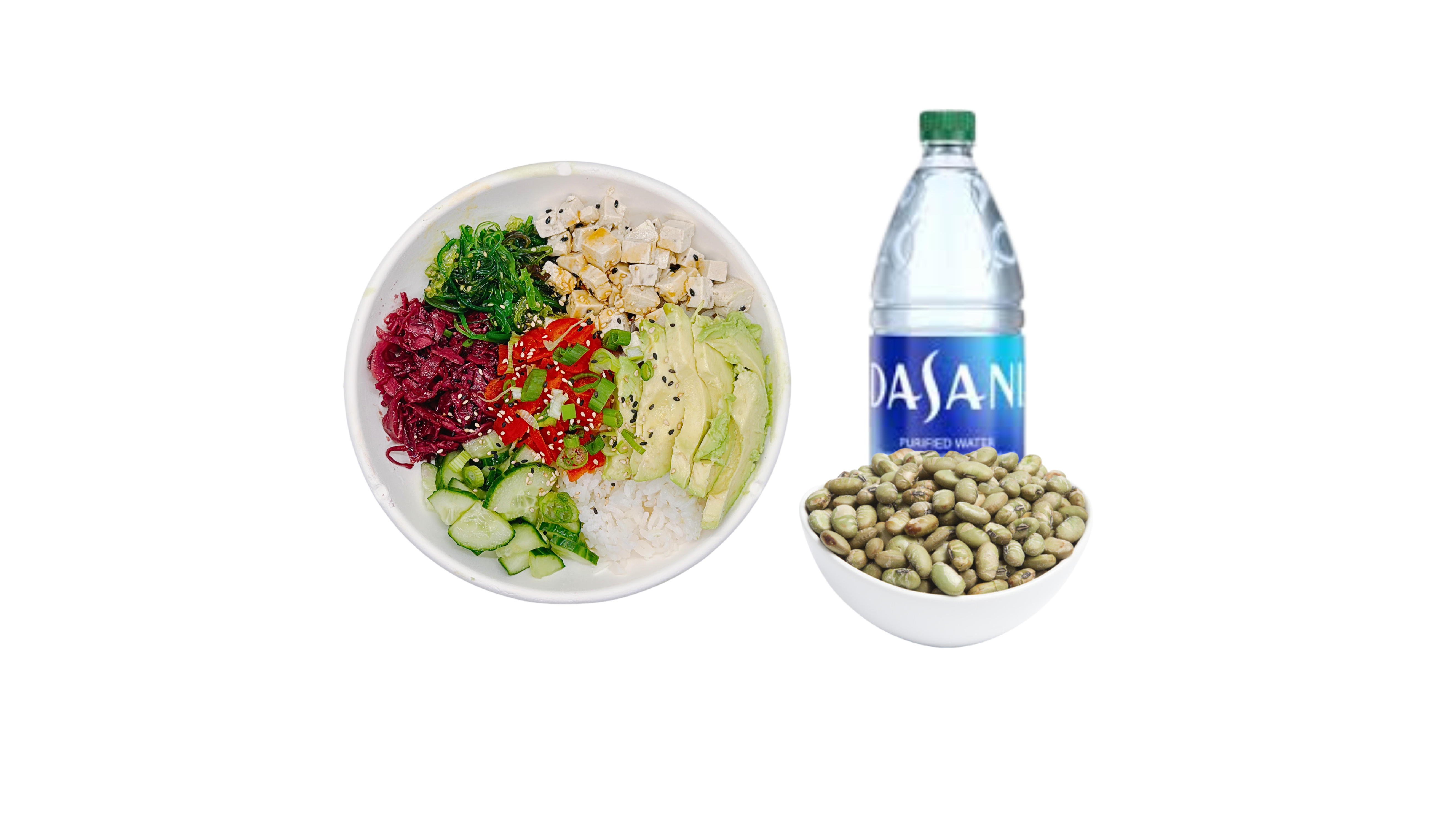 All goodness in one bowl. Sushi rice topped with organic tofu, cucumber, Hawaiian cole slaw, avocado, seaweed salad, red ginger, sweet shoyu sauce, and sprinkle with green onion and toasted sesame seeds.