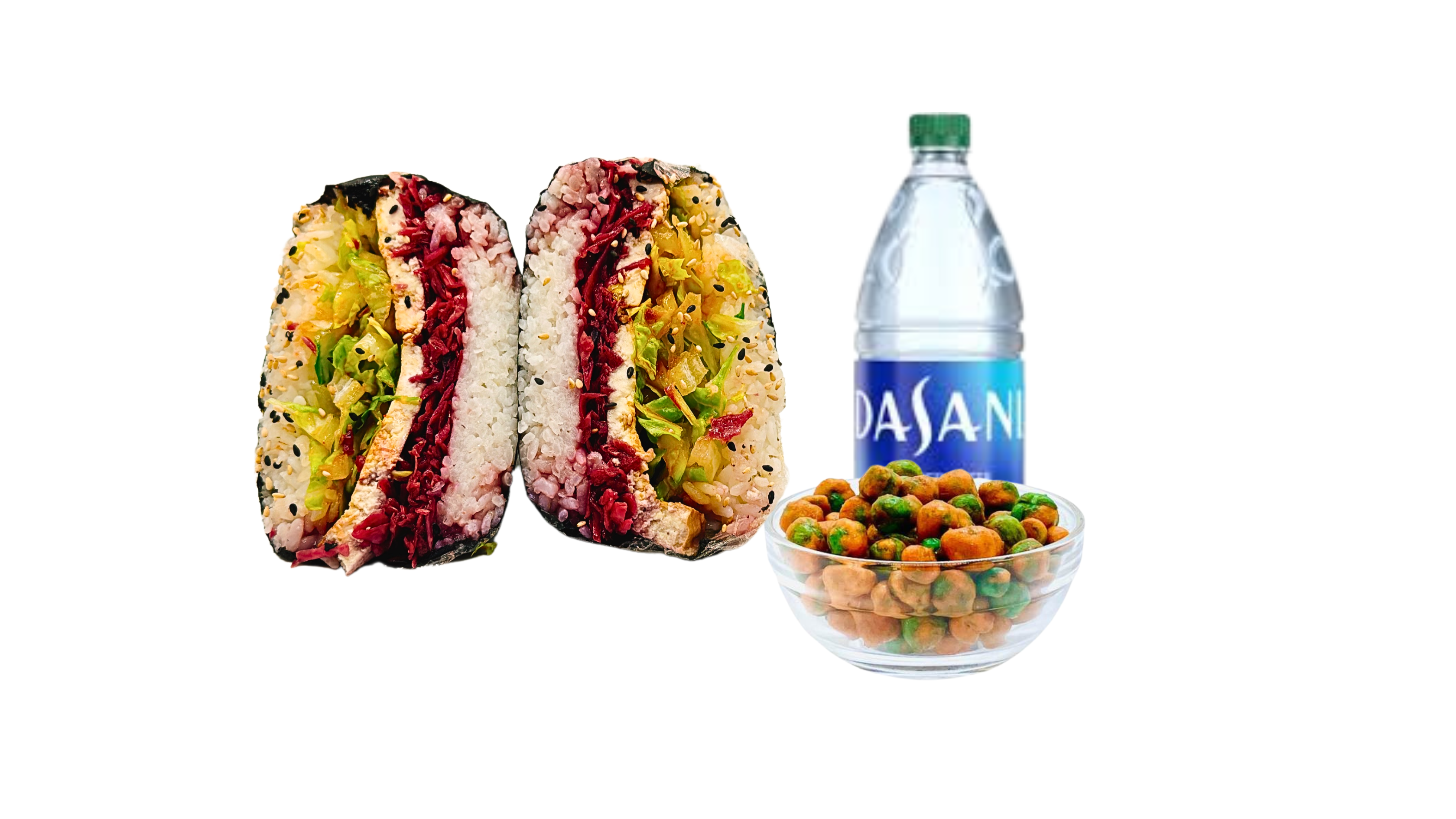Supersize musubi (Chicken karaage, pickled cabbage, toasted sesame seeds, cm mayo) wrapped in a roasted seaweed sheet. Combo it with your choice of One Side and One Drink.