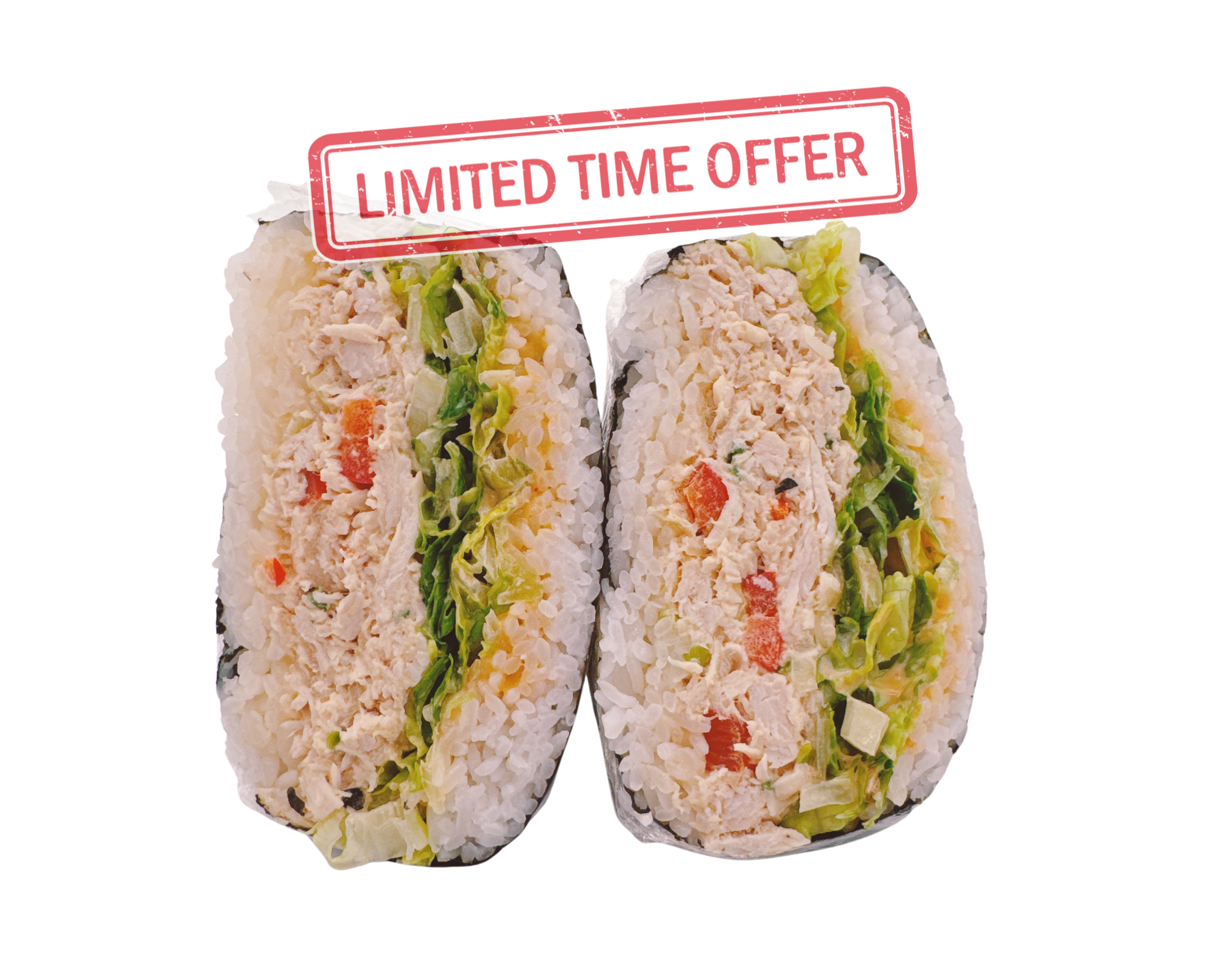 Supersize Musubi (Pan fried Organic Firm Tofu, Hawaiian pickle coleslaw, lettuce, sweet chili gojuchang, toasted sesame seeds) wrapped in roasted seaweed sheet.